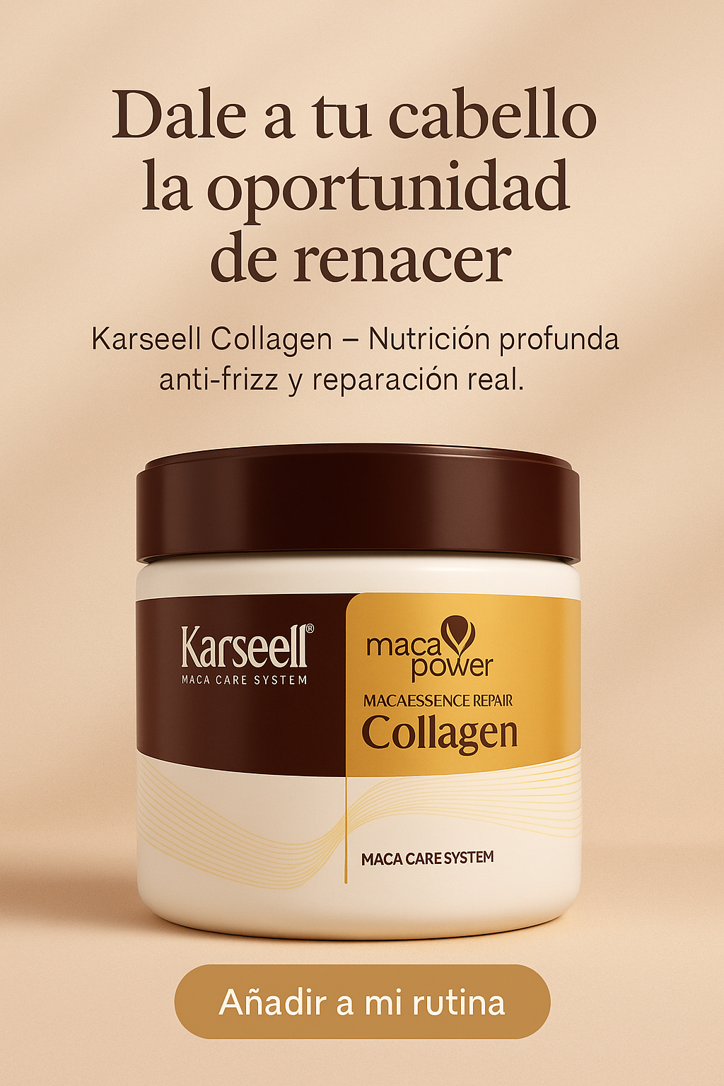Devuelve la vida a tu cabello con una reparación profunda que se siente desde el primer toque. La combinación de Maca y Colágeno crea un ritual nutritivo de lujo que transforma fibra por fibra, dejando tu melena más suave, brillante y fuerte que nunca.